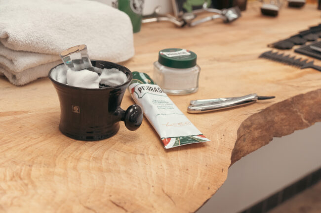 Glad scheren van het gezicht met een open scheermes, waarbij we gebruikmaken van kwaliteitsproducten van Proraso.